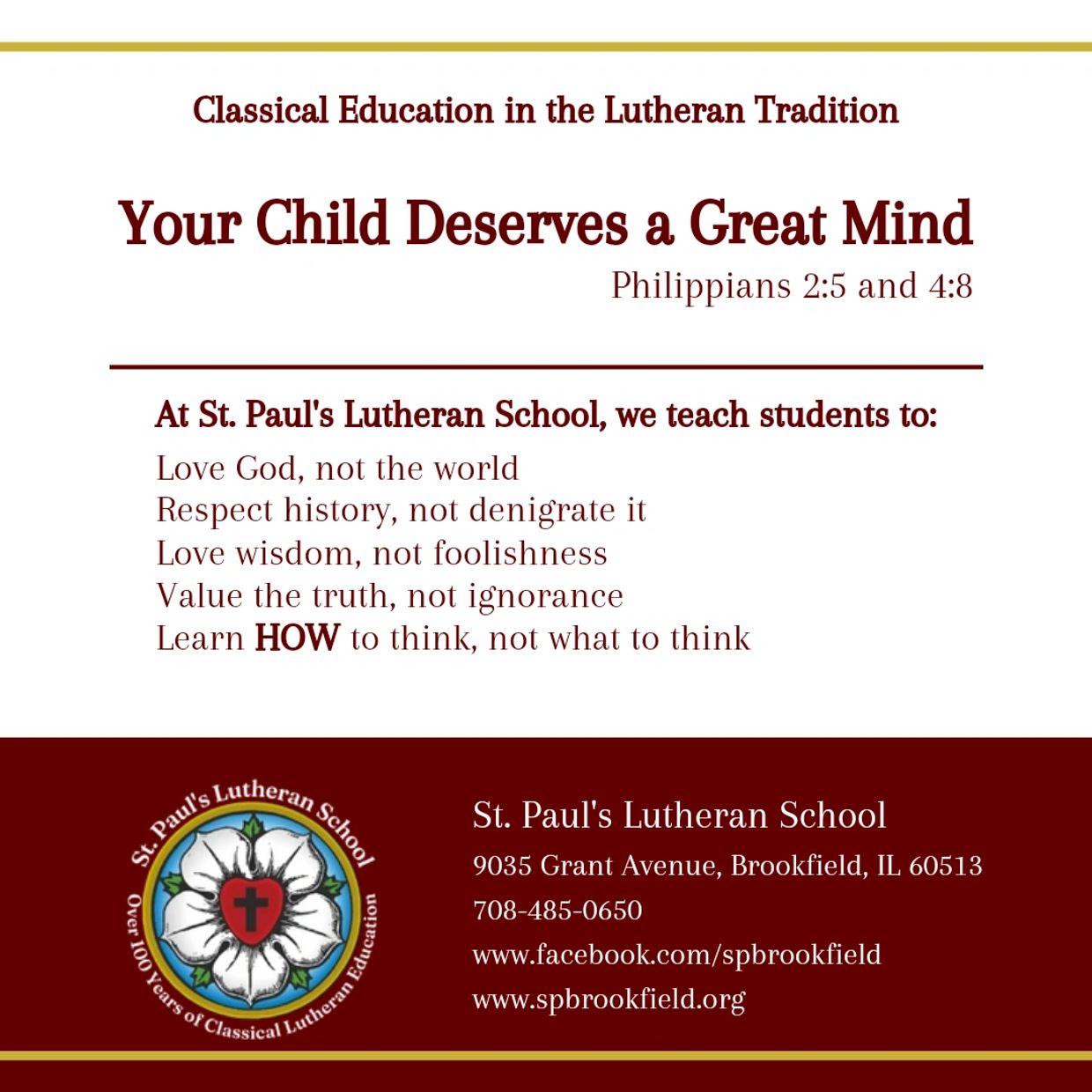 St. Paul's Lutheran School prepares children for the future by providing knowledge and skills to achieve academic excellence, personal growth, and success in a safe, positive and Classical Lutheran environment. We offer basic education in the core disciplines and humanities: reading, writing, science, mathematics, geography, history, lite
